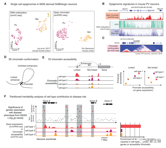 图3、 单细胞表观基因组。 A、MGE来源的抑制神经元的单细胞甲基化和染色质可及性图谱。B、基因组浏览器显示基因Lhx6的单细胞ATAC、甲基化图谱。C、额叶皮质VIP细胞的三维构象。D、染色质Loop结构表示,增强子与基因启动子互作。E、利用一维ATAC数据推断增强子和启动子互作。F、疾病相关细胞类型鉴定。